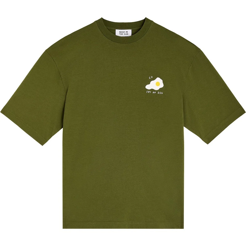 Tee-shirt en coton biologique coloris olive, orné d’un petit imprimé poitrine représentant un œuf au plat accompagné de l’inscription humoristique “Go Fry an Egg”. Une pièce décontractée et originale, fidèle à l’univers graphique et décalé de Bask in the Sun, fabriquée avec soin au Portugal.