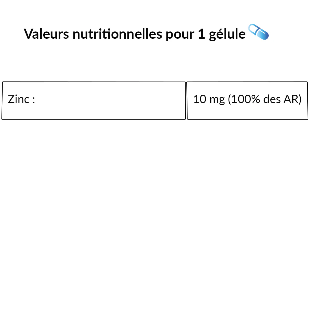 Situation type : Vous souhaitez soutenir votre système immunitaire¹, préserver votre peau ou vos ongles² et lutter contre le stress oxydatif au quotidien³ ? Notre ZINC apporte une forme de bisglycinate de zinc hautement assimilable et bien tolérée, pour soutenir votre bien-être général, sans inconfort digestif.